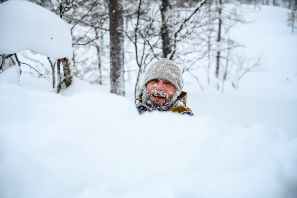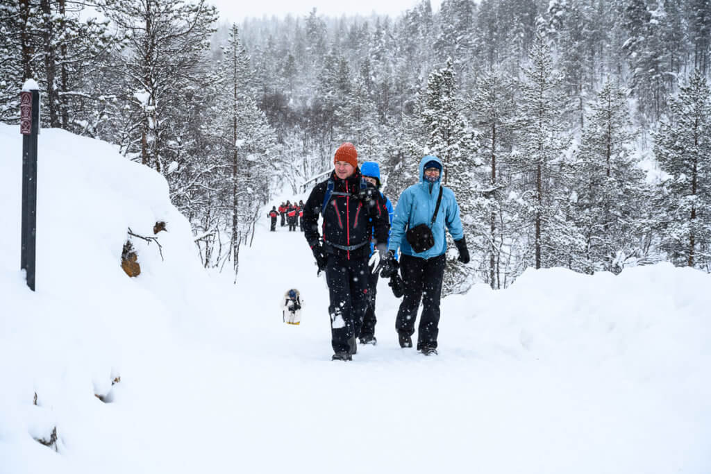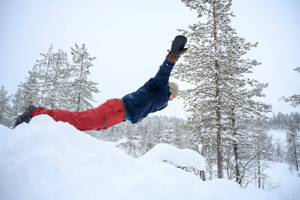 Auch am Dienstag blieb das Wetter trüb – bedeckter Himmel, Schneefall, keine Chance auf Nordlichter. Trotzdem unternahmen wir einen Spaziergang zur Talstation des Kaunispää (438 m). Unterwegs sorgte eine spontane Schneebadeaktion für gute Laune – manche hatten wohl kurz vergessen, dass Winter war.