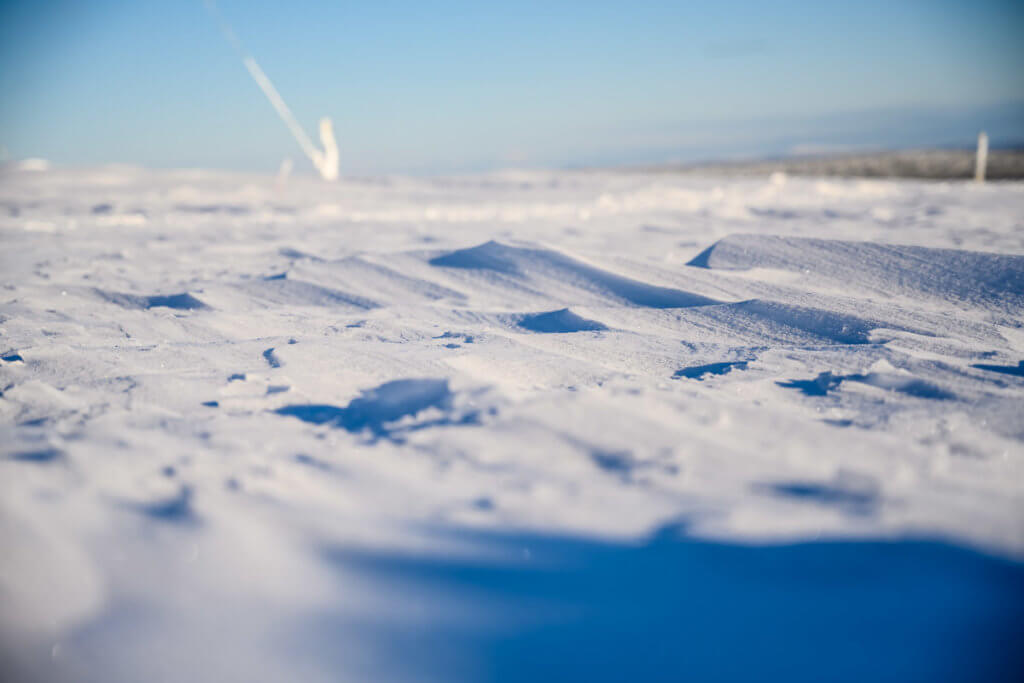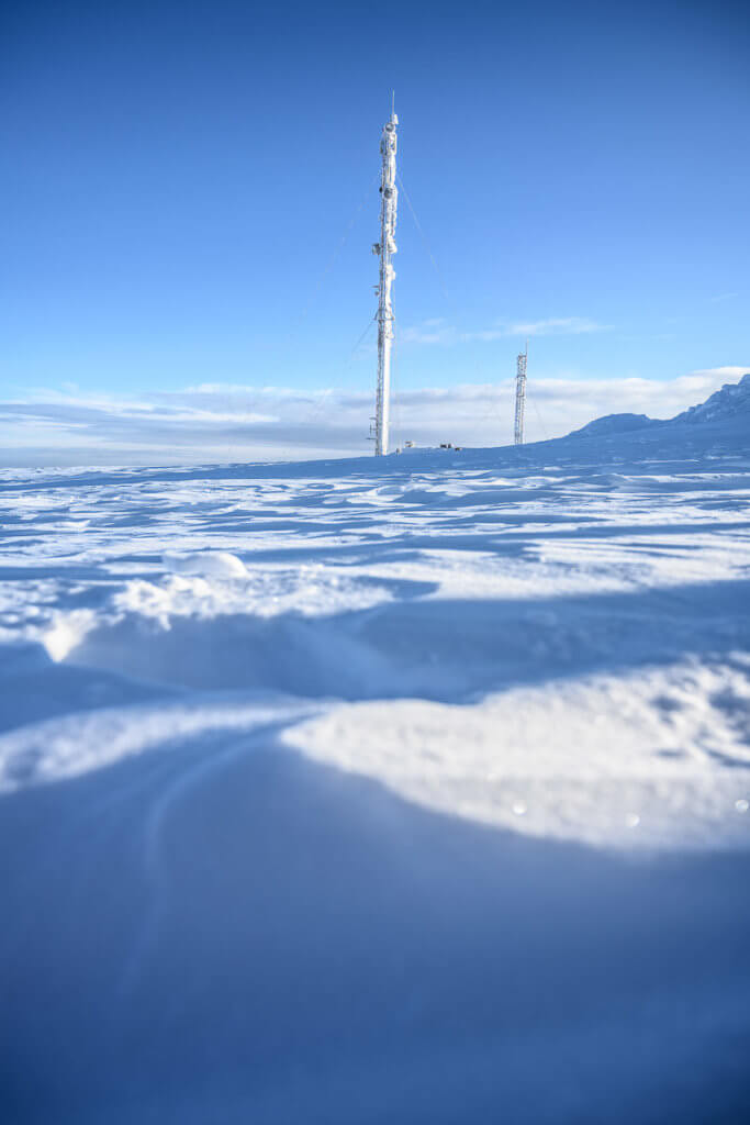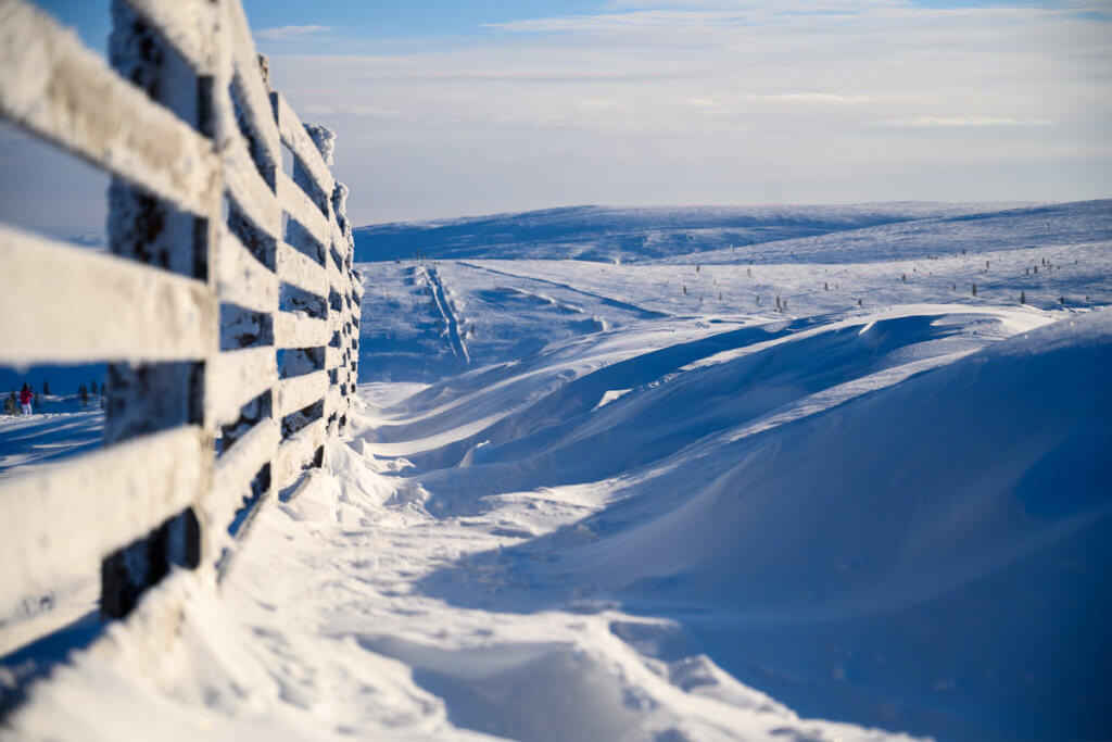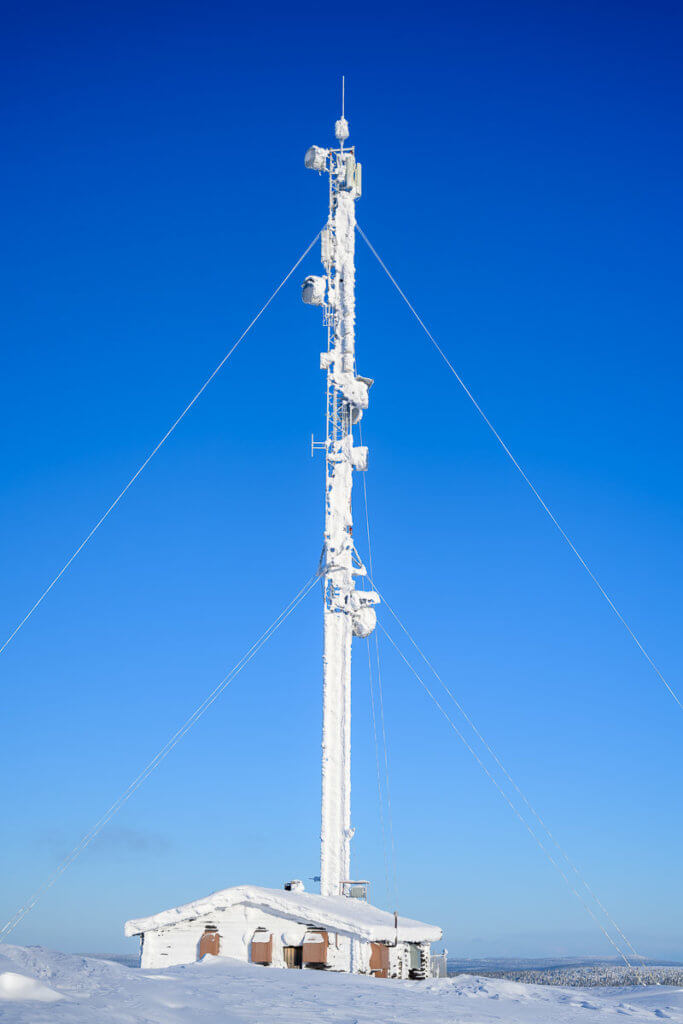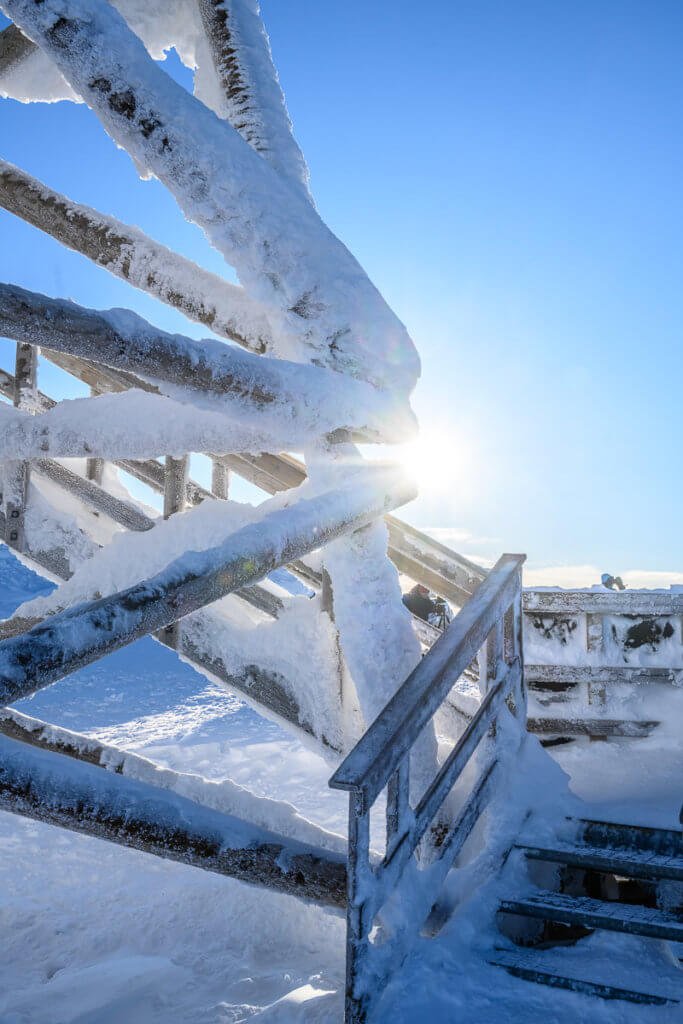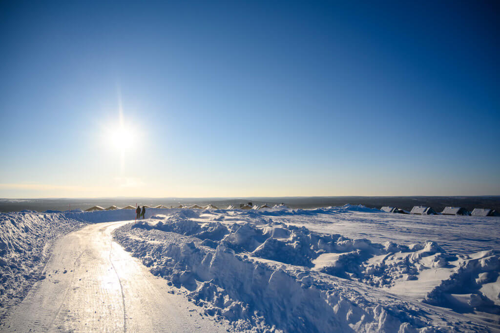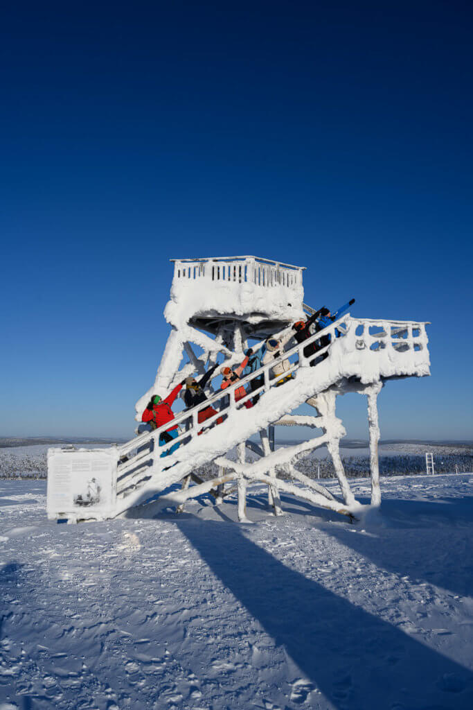 Am Tag fuhren wir mit dem Shuttle auf den Kaunispää. Dort erwartete uns eine faszinierende Eislandschaft: Zäune, Pfosten, Schilder – alles war dick vereist. Wir fotografierten aus allen Blickwinkeln, bis uns bei -20°C und starkem Wind doch zu kalt wurde. Eine wärmende Pause mit Kakao und Pommes in der Hütte kam da gerade recht. Zurück ging’s zu Fuss – etwa 45 Minuten durch die Winterlandschaft.