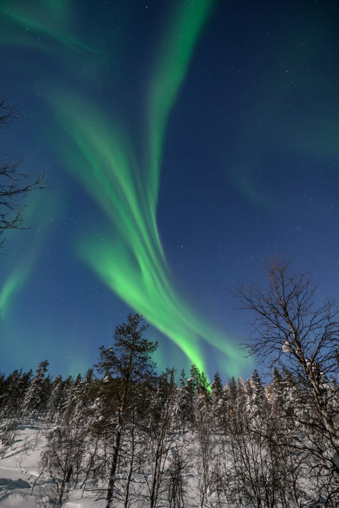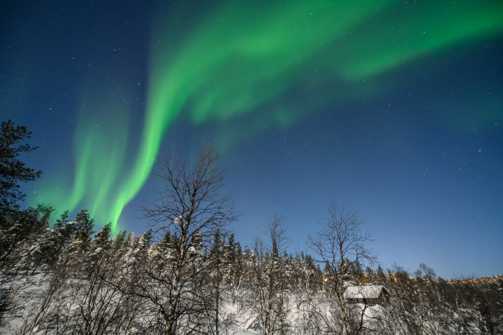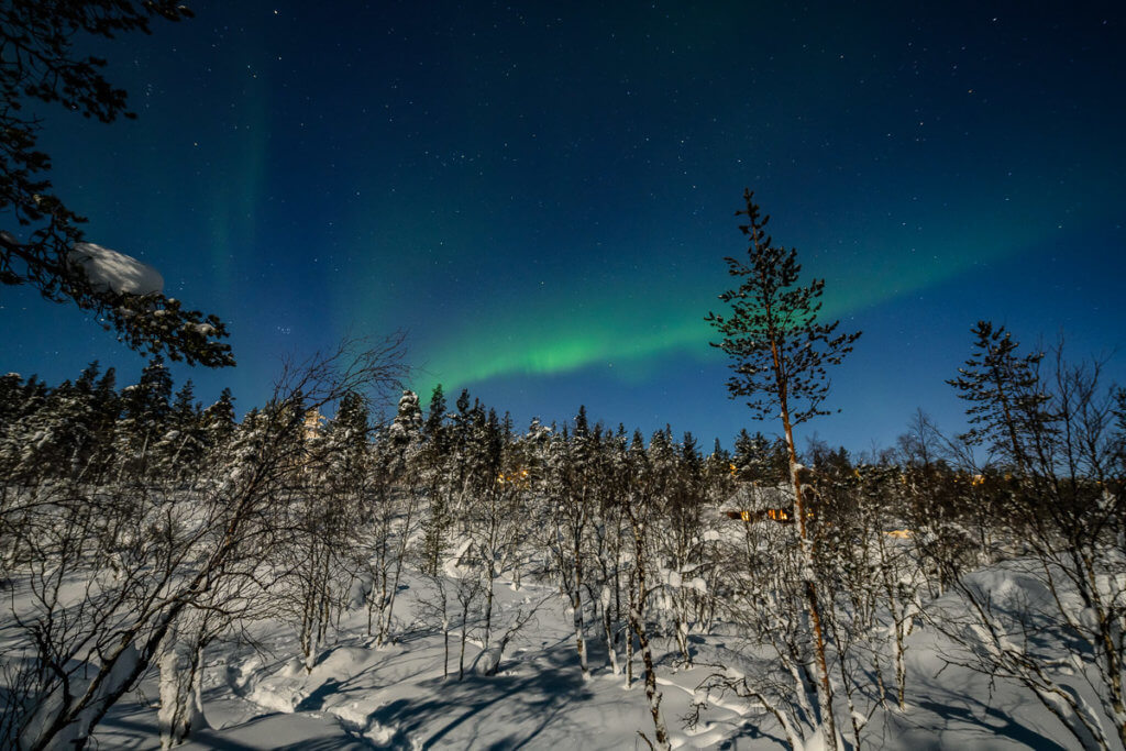 Abends begannen die Vorbereitungen: Heizsohlen, Thermounterwäsche, Kamera-Ausrüstung – alles musste sitzen. Um 20:15 brachte uns das Taxi erneut auf den Kaunispää. Kurz nach Ankunft leuchteten die ersten Nordlichter am Himmel – und es wurde mit jeder Minute spektakulärer.